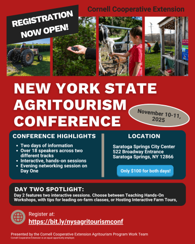 The Cornell Cooperative Extension Agritourism Program Work Team invites farmers, tourism professionals, educators, and community leaders to attend the New York State Agritourism Conference in Saratoga Springs, NY. This two-day event on Monday, November 10 and Tuesday, November 11, will offer valuable insights and hands-on learning opportunities for anyone interested in strengthening or starting an agritourism enterprise.