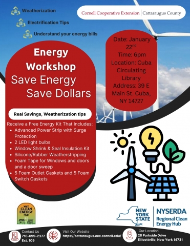 Cornell Cooperative Extension of Cattaraugus County (CCE) is pleased to invite community members to a free Energy Literacy Event at the Cuba Circulating Library on January 22nd at 6:00 PM. This event is to help residents across the Allegany, Cattaraugus, and Chautauqua counties save energy, reduce household energy costs, and make informed decisions about sustainable living.