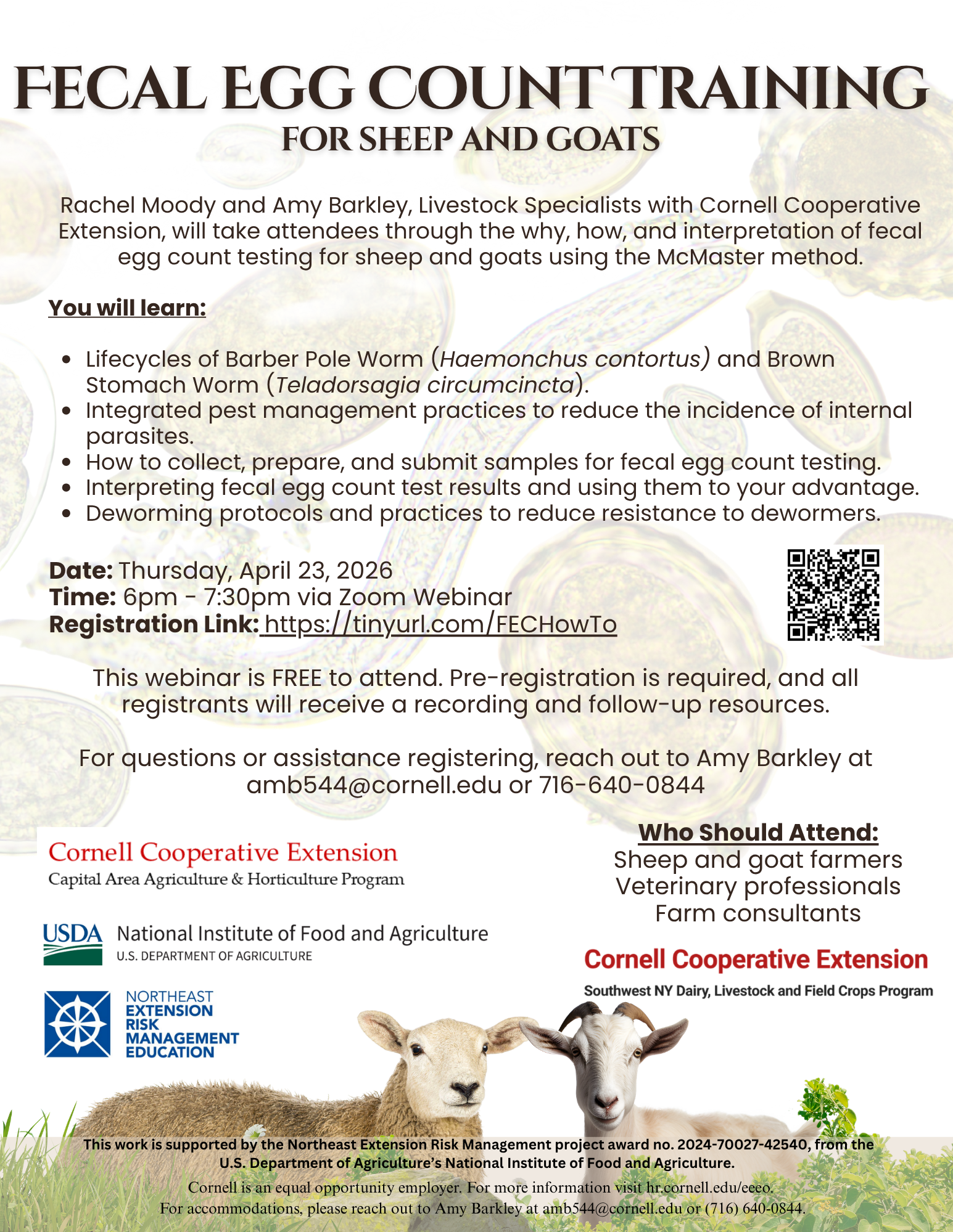 Rachel Moody and Amy Barkley, Livestock Specialists with Cornell Cooperative Extension, invite farmers, veterinary professionals, and farm consultants to learn the why, how, and interpretation of fecal egg count testing for sheep and goats using the McMaster method. This methodology helps farmers to understand the internal parasite burdens in their small ruminants to help them make informed decisions on which animals to deworm, breed, or remove from the herd. Using this method in combination with other tests such as FAMACHA and fecal egg count reduction tests can help you determine if a particular dewormer is still effective on your farm.